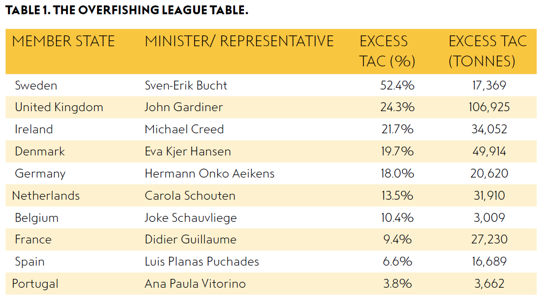 For the 2019 Northeast Atlantic TACs, Sweden, the United Kingdom, and Ireland top the league table of Member States with the highest percentage of their TAC in excess of scientific advice (Table 1). These Member States were involved with TAC decisions that allow fishing at 52%, 24%, and 22%, respectively, above scientific advice.