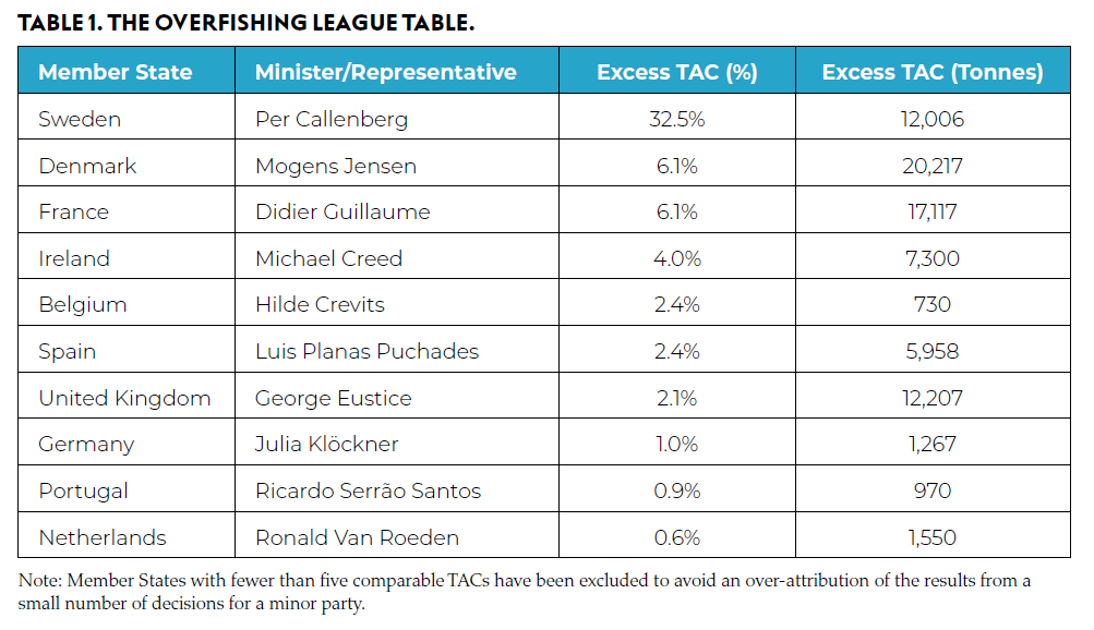 For the 2020 Northeast Atlantic TACs, Sweden, Denmark, and France top the league table of Member States with the highest percentage of their TAC in excess of scientific advice (Table 1). These Member States were involved with TAC decisions that allow fishing at 32%, 6%, and 6%, respectively, above scientific advice. Sweden also topped the 2019 overfishing league from last year’s analysis.