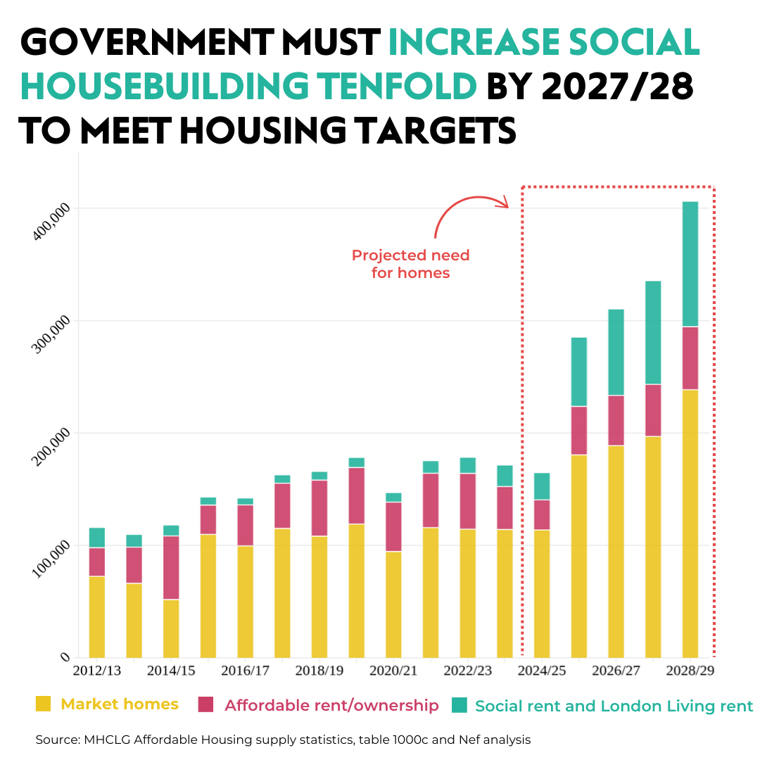 3. Social housing investment: Increasing funding for social housebuilding is welcome news. However, much more is needed at the spending review to meet the government’s own house building target of 1.5million. NEF analysis found they will need to be building 90,000 social homes annually by 2027/2028.