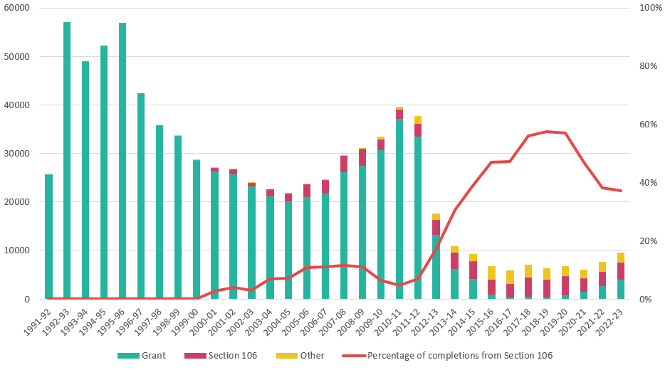 Figure 1: Social rent grant versus Section 106 completions since 1991